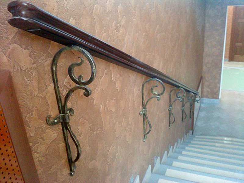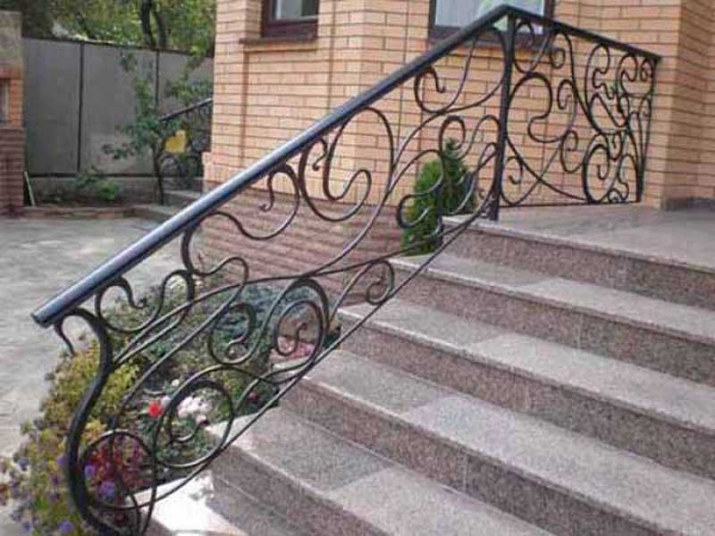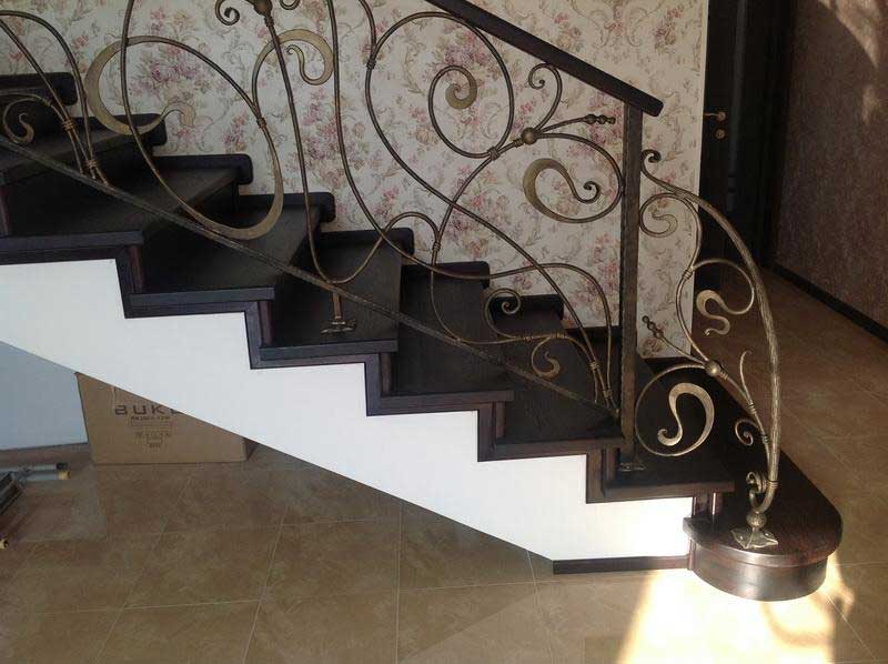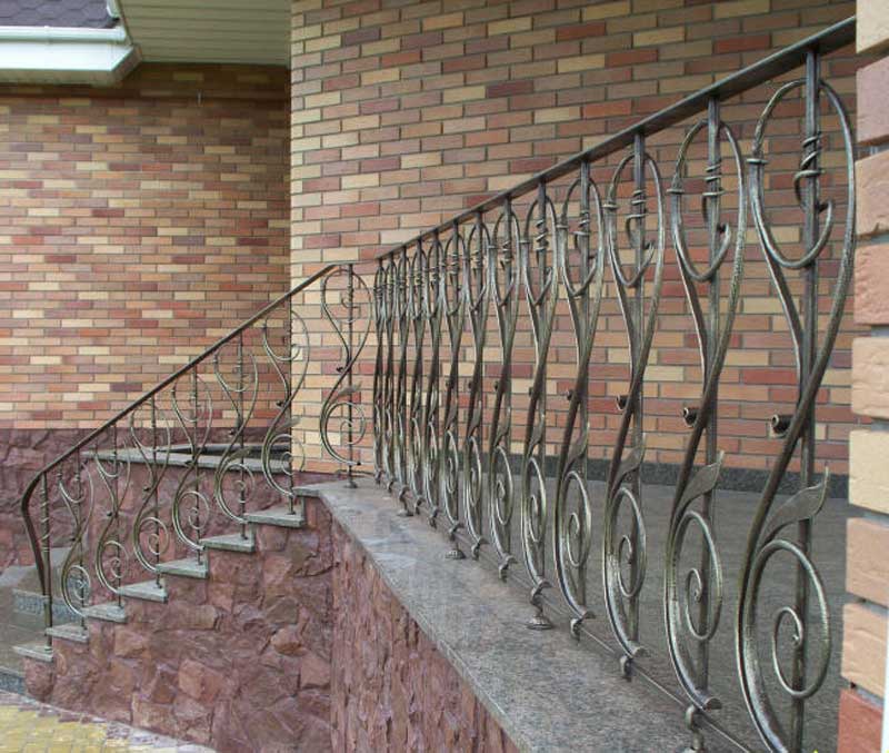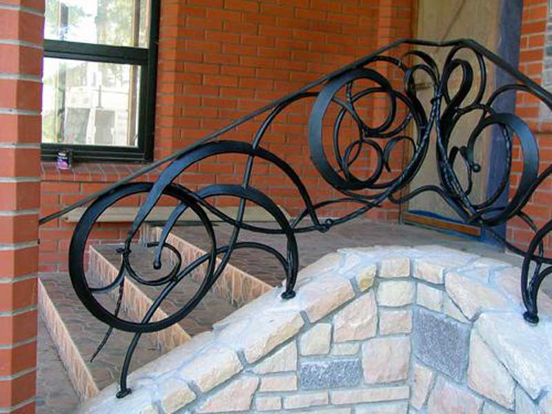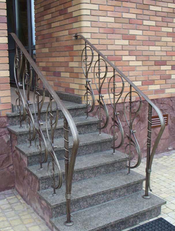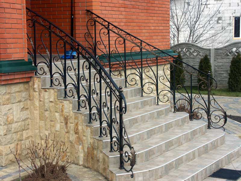 Дизайнерское решение не повлияет на геометрию, и из-под рук мастера появится винтовая или маршевая лестница, установленная на бетон, мрамор, известняк, дерево – любой материал отлично будет сочетаться с ковкой. Поручни лестниц оставляют металлическими или декорируют камнем или деревом.