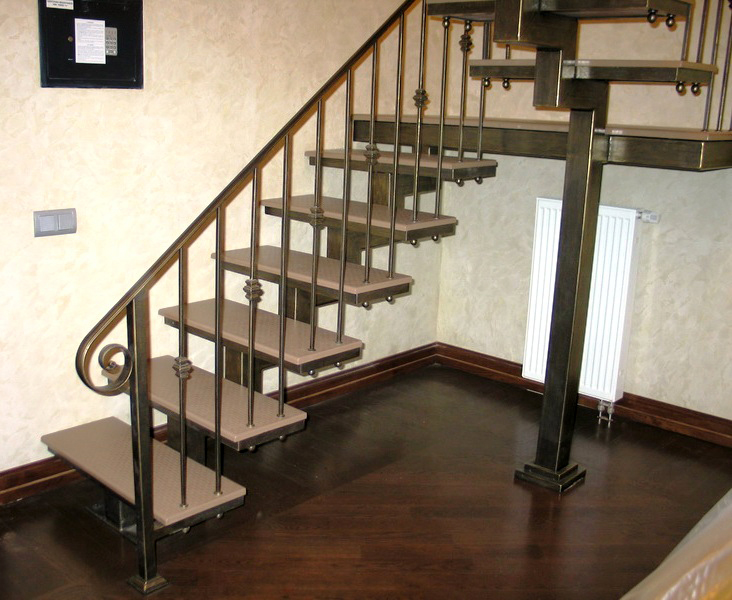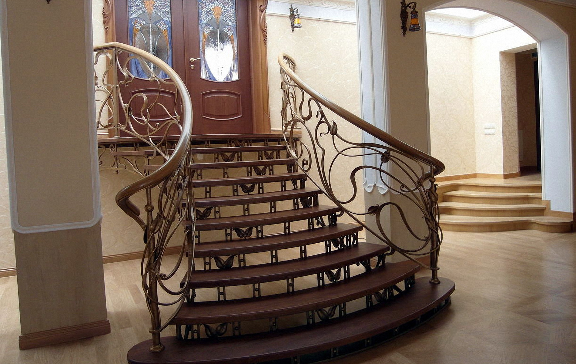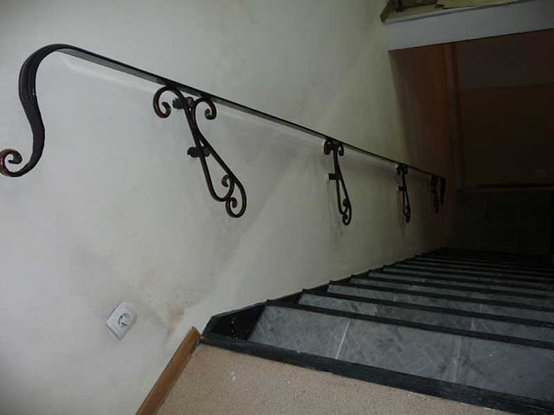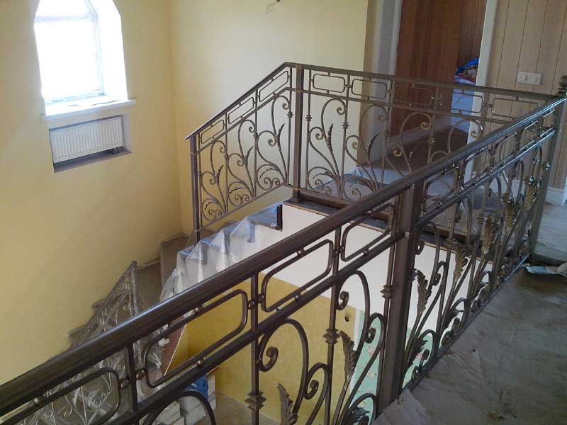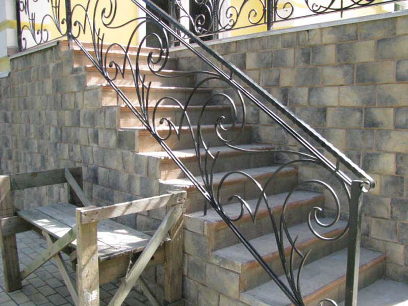 Дизайнерское решение не повлияет на геометрию, и из-под рук мастера появится винтовая или маршевая лестница, установленная на бетон, мрамор, известняк, дерево – любой материал отлично будет сочетаться с ковкой. Поручни лестниц оставляют металлическими или декорируют камнем или деревом.